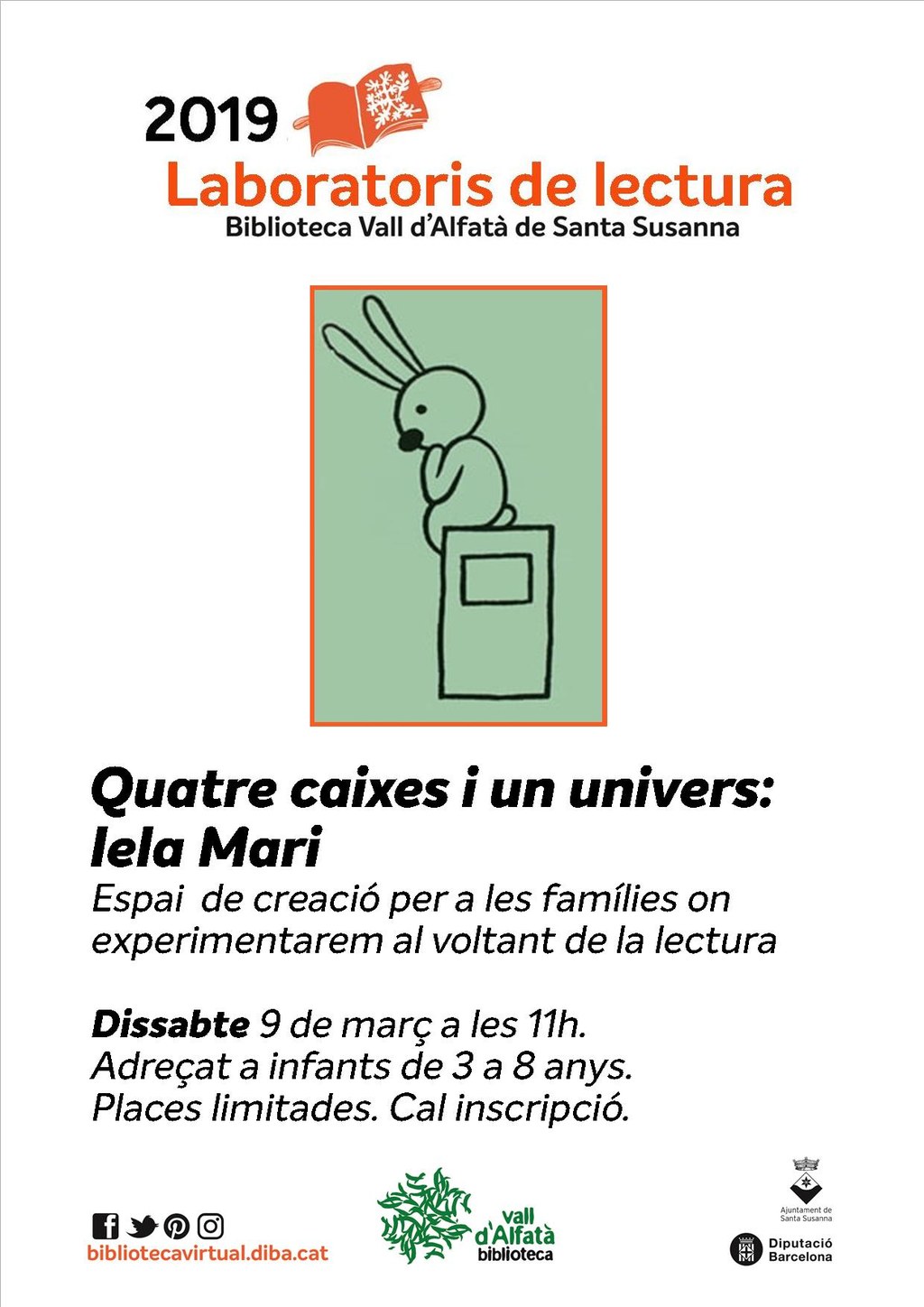 - "Quatre caixes i un univers: Iela Mari", espai de creació per a famílies on experimentarem al voltant de la lectura. Adreçat a nens i nenes de 3 a 8 anys. Les places són limitades, cal inscripció!
