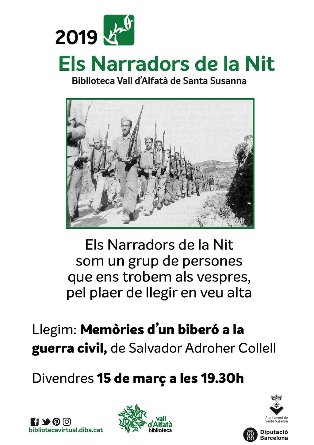 Nova trobada d'Els Narradors de la Nit. En aquesta ocasió es llegirà l'obra Memòries d'un biberó a la guerra civil, de Salvador Adroher Collell.