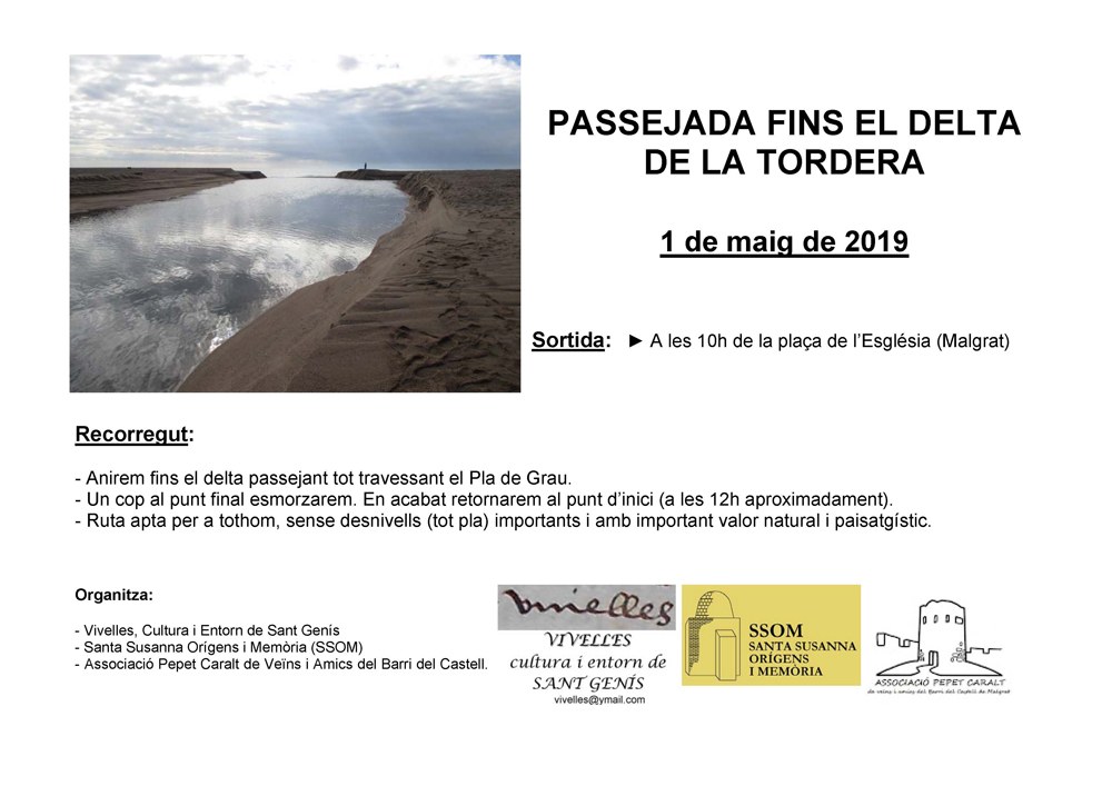Passejada fins al Delta de la Tordera organitzada per l'Associació Pepet Caralt de Veïns i Amics del Barri del Castell, Vivelles Cultura i Entorn de Sant Genís i Santa Susanna Orígens i Memòria (SSOM); tres entitats amb objectius comuns.