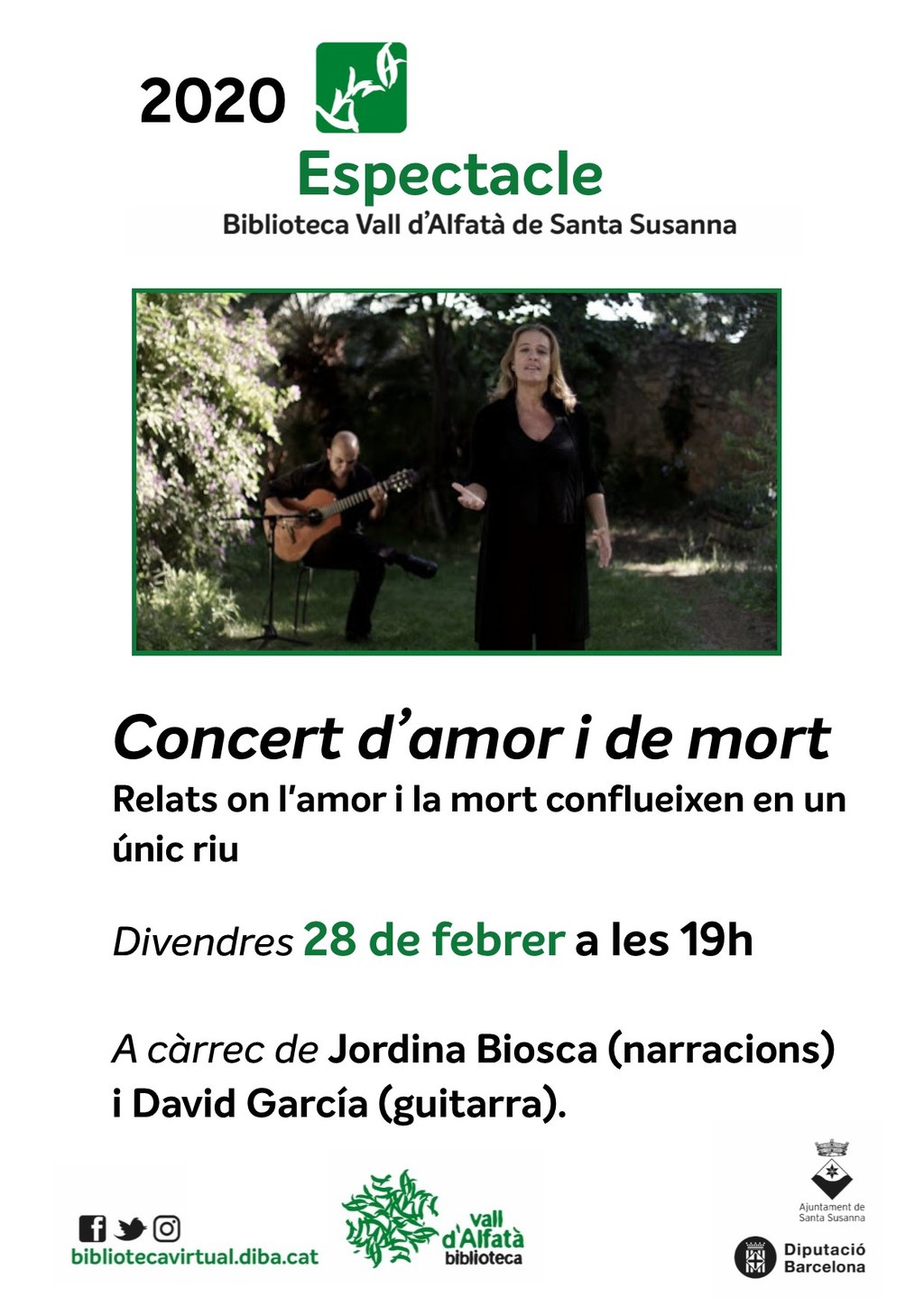 Concert d'amor i de mort a la Biblioteca Vall d'Alfatà. Relats on l'amor i la mort conflueixen en un únic riu, a càrrec de Jordina Biosca (narracions) i David García (guitarra).