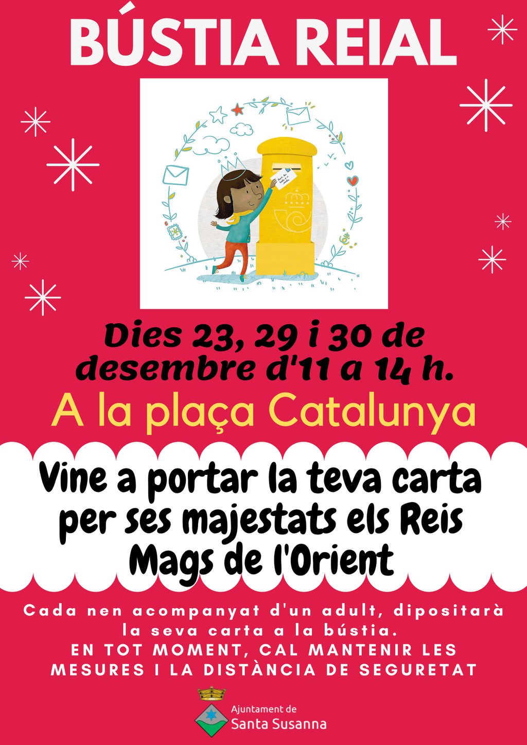 - Els Reis Mags han deixat una bústia a l'Ajuntament perquè totes les nenes i nens de Santa Susanna pugueu deixar les cartes amb els vostres desitjos. Trobareu la bústia a la porta de l’Ajuntament els dies 23, 29 i 30 de desembre.