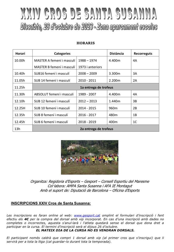 L'Ajuntament de Santa Susanna, amb la coorganització de Gesport i el Consell Esportiu del Maresme, organitza el 24è Cros de Santa Susanna, el pròxim dissabte 28 d'octubre al Parc d'en Colomer (zona aparcaments escolars).