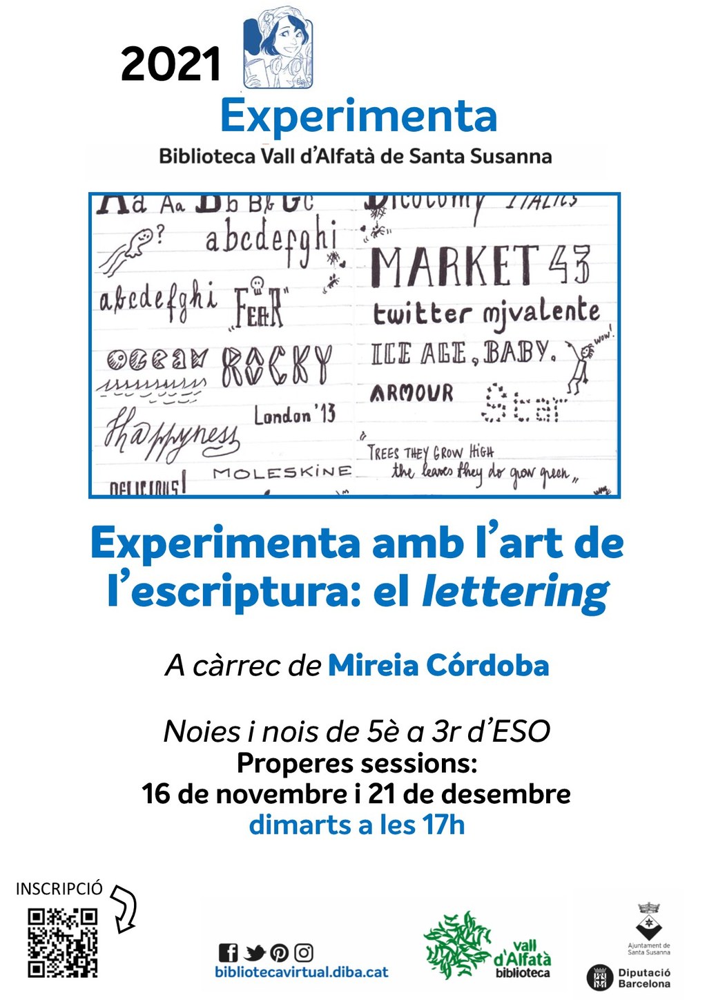 - Nova sessió de lettering al taller Experimenta de la Biblioteca Vall d'Alfatà, amb Mireia Córdoba. Per a nois i noies de 5è a 3r d'ESO, us podeu inscriure aquí.
