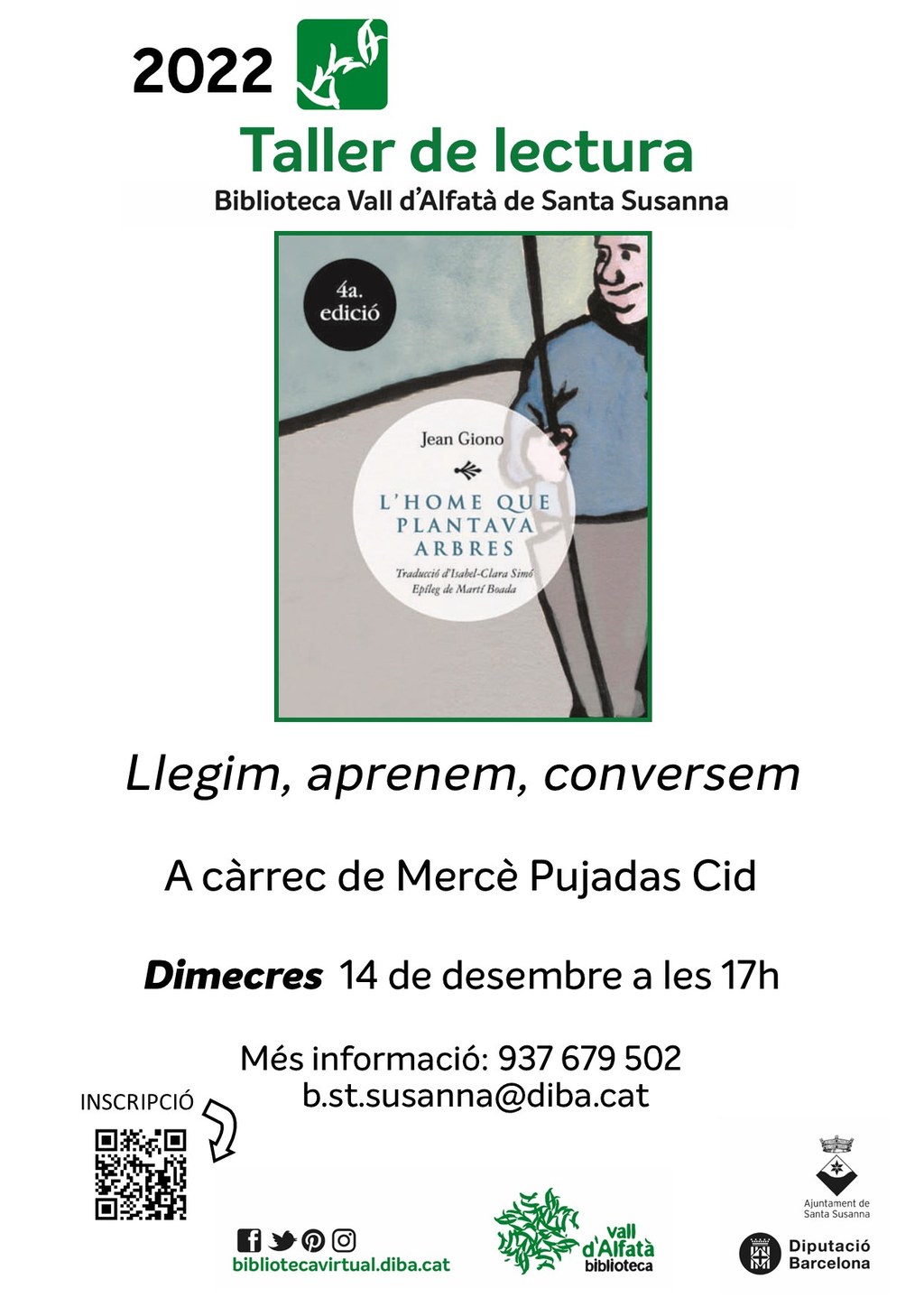 El pròxim dimecres 14 de desembre, la Biblioteca Vall d'Alfatà organitza el taller de lectura "Llegim, aprenem, conversem" on es tractarà l'obra "L'home que plantava arbres" de l'autor Jean Guini amb traducció d'Isabel-Clara Simó i epíleg de Martí Boada. L'acte tindrà lloc a les 17 h i anirà a càrrec de Mercè Pujadas Cid.