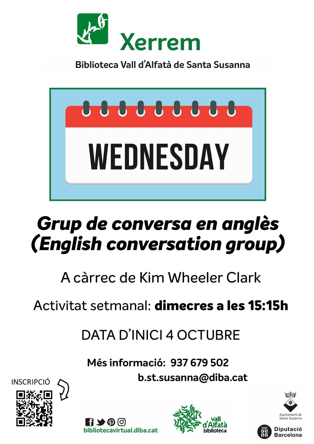 Durant el mes d'octubre i cada dimecres, la Biblioteca Vall d'Alfatà organitza el "Grup de conversa en anglès" a càrrec de Kim Weheeler Clark.