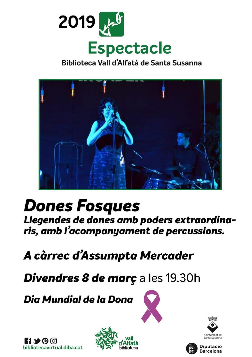 - Amb motiu del Dia Internacional de les Dones se celebraran diferents actes a Santa Susanna. Vine a celebrar-ho amb nosaltres! 13 h. Se sortirà de la Plaça de Catalunya, vestits de fosc i amb el llaç lila. Tot seguit es llegirà el manifest i es duran a terme diverses declaracions (per a tothom qui ho desitgi). 19.30 h. "Dones Fosques", llegendes de dones amb poders extraordinaris amb l'acompanyament de percussions. A la Biblioteca Vall d'Alfatà i a càrrec d'Assumpta Mercader.