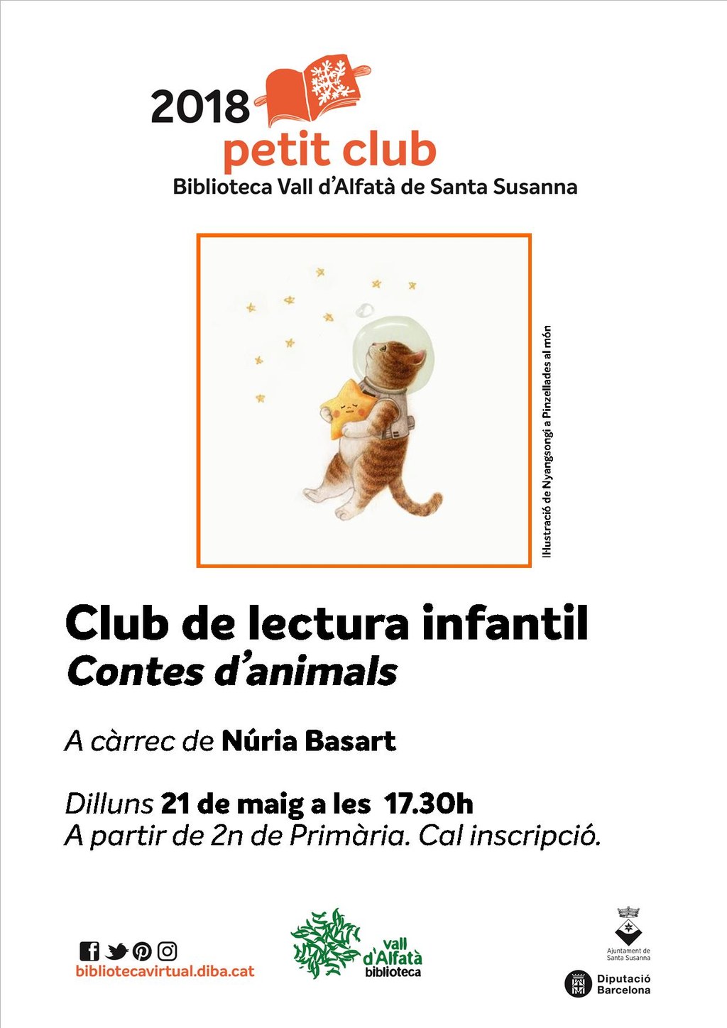 - Club de lectura infantil: contes d'animals a càrrec de Núria Basart. Una activitat a partir de 2n de primària. Cal inscripció.