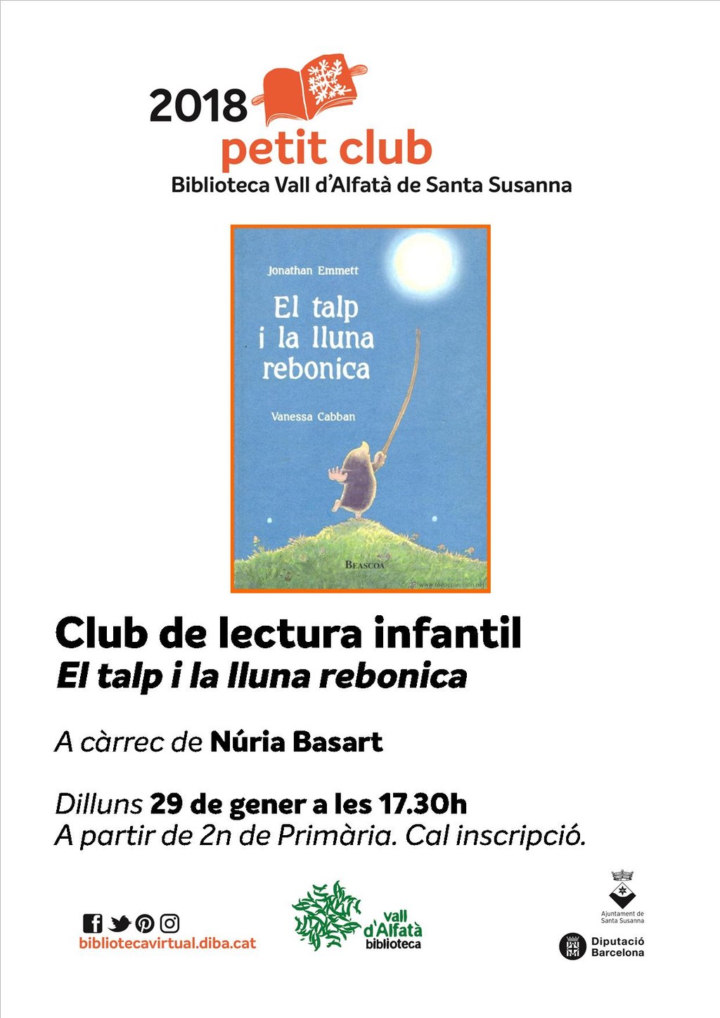 - Club de lectura infantil: El talp i la lluna rebonica. A càrrec de Núria Basart. Dilluns 29 de gener a les 17:30 h. A partir de 2n de Primària. Cal inscripció.