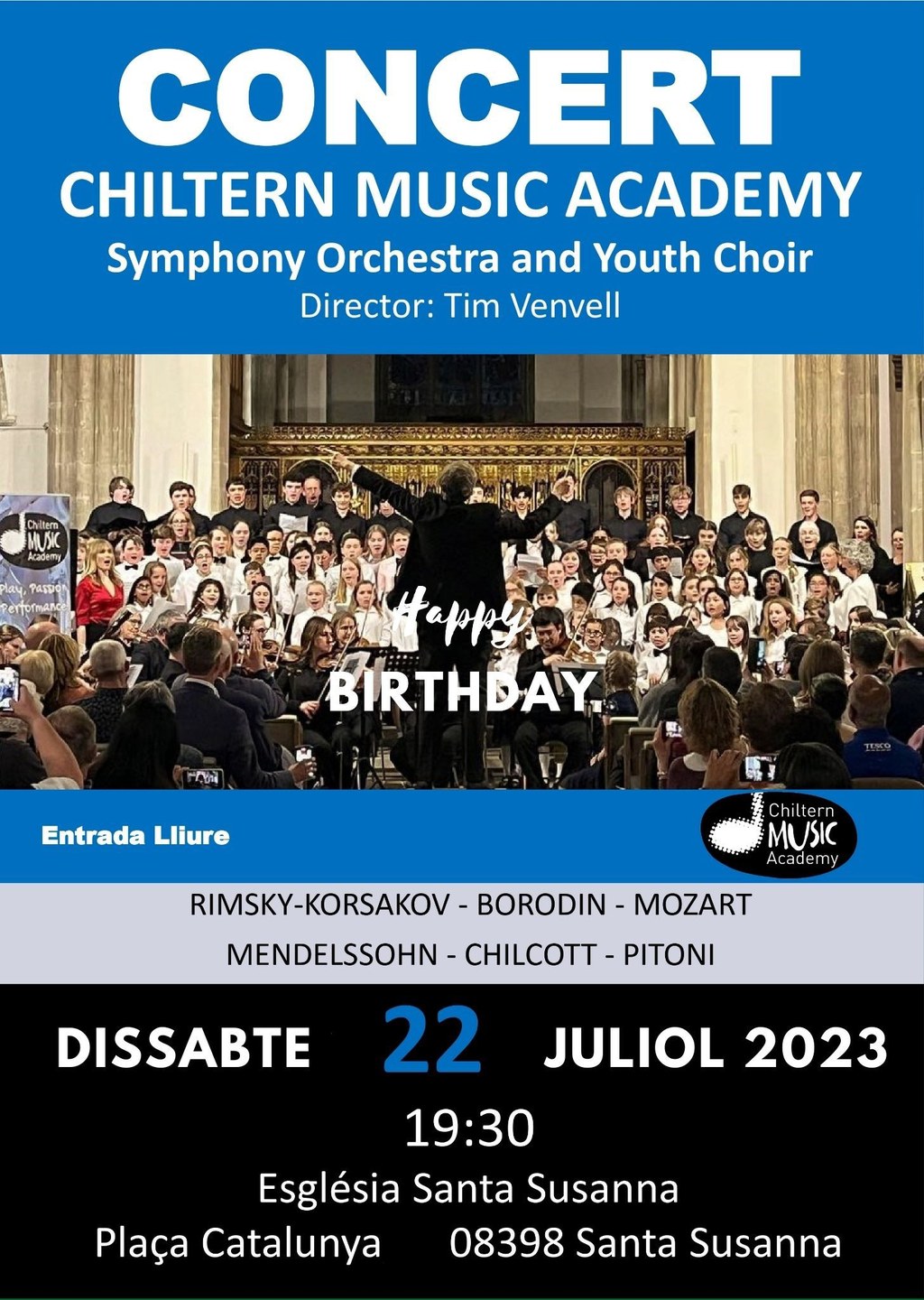 L’Acadèmia de Música de Chiltern (Chiltern Music Academy) actuarà aquest dissabte a Santa Susanna aprofitant que estan allotjats en un hotel del poble. Aquest prestigiós centre farà dos concerts. Amb el cor i l’orquestra simfònica de l’acadèmia actuaran a l’església parroquial (19:30 h) interpretant Rimsky Korsakov, Borodin, Mozart, Mendelssohn, Chilcott i Pitoni.