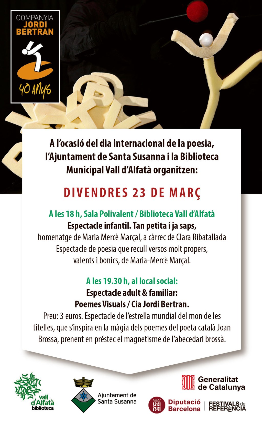 a les 19:30h al local social Espectacle adult&familiar: Poemes visuals de la Cia Jordi Bertran. Preu de l'entrada: 3€.
