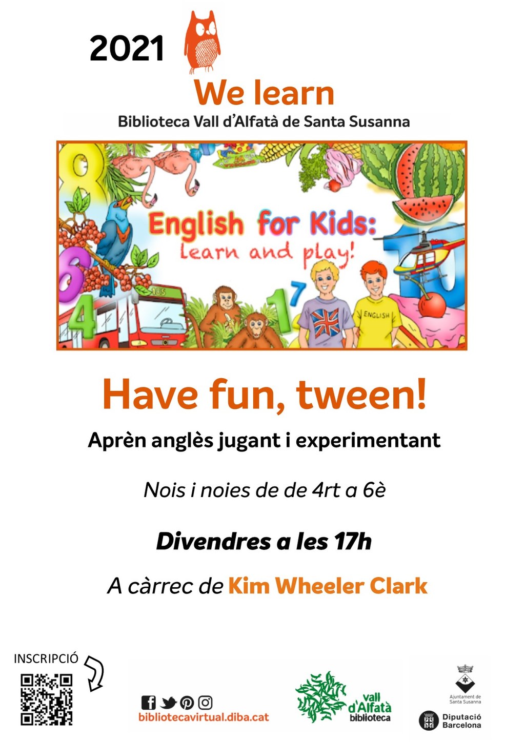 Taller per aprendre anglès jugant i experimentant per a noies i nois de 4t a 6è de primària, a càrrec de Kim Wheeler Clark. Cada divendres (excepte festius segons calendari escolar) d'octubre a maig. Inscripcions aquí.