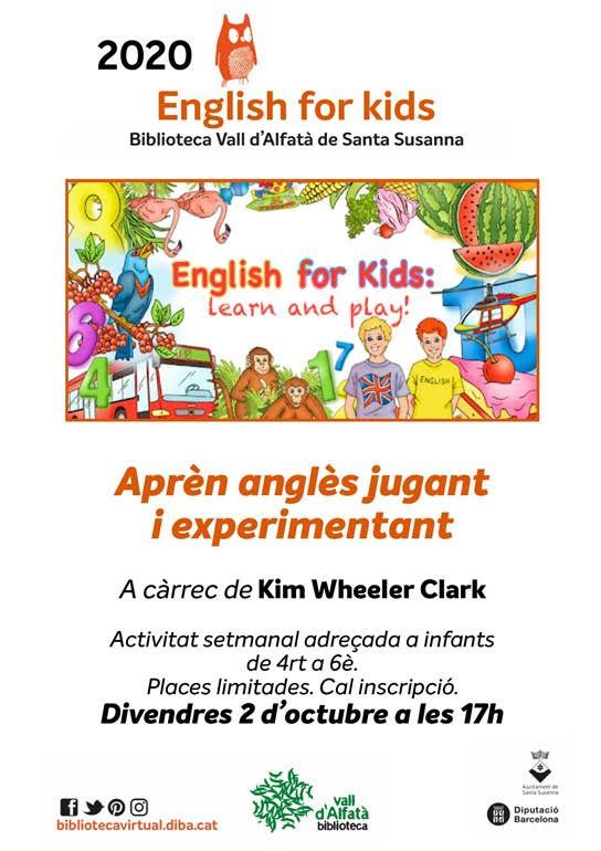 - Voleu que el vostre fill o filla practiqui l'anglès d'una manera didàctica, jugant i fent experiments? Apunteu-los a English for kids amb Kim Wheeler! (de 4art a 6è) Limitació d’aforament i amb inscripció https://forms.gle/YbkkK9KjzVXgimx17