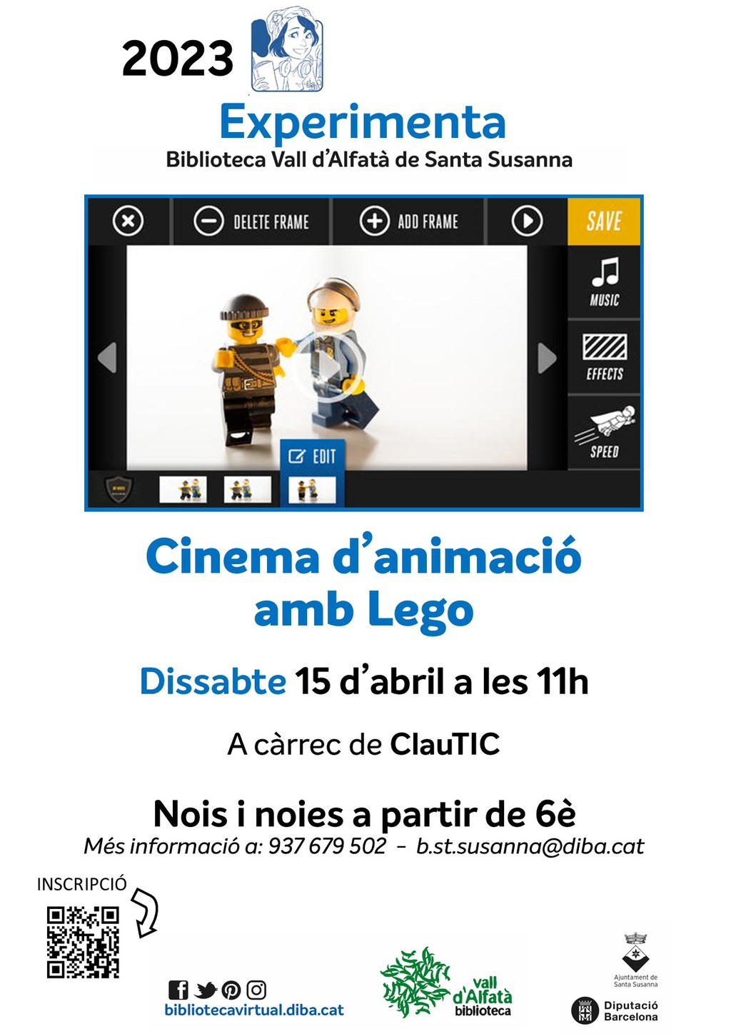 El pròxim dissabte 15 d'abril a les 11 h, la Biblioteca Vall d'Alfatà organitza una nova sessió de l'"Experimenta". En aquest cas, es farà "Cinema d'animació amb Lego" per a nois i noies a partir de 6è de Primària i l'acte anirà a càrrec de ClauTIC.