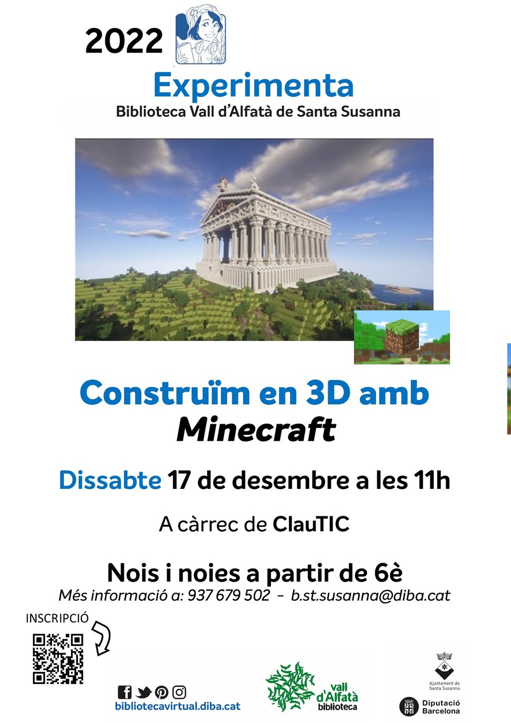 El pròxim dissabte 17 de desembre, la Biblioteca Vall d'Alfatà organitza l'activitat emmarcada dins Experimenta "Construïm en 3D amb Minecraft". L'acte s'iniciarà a les 11 h, anirà a càrrec de ClauTIC i s'adreça a noies i nois a partir de 6è.
