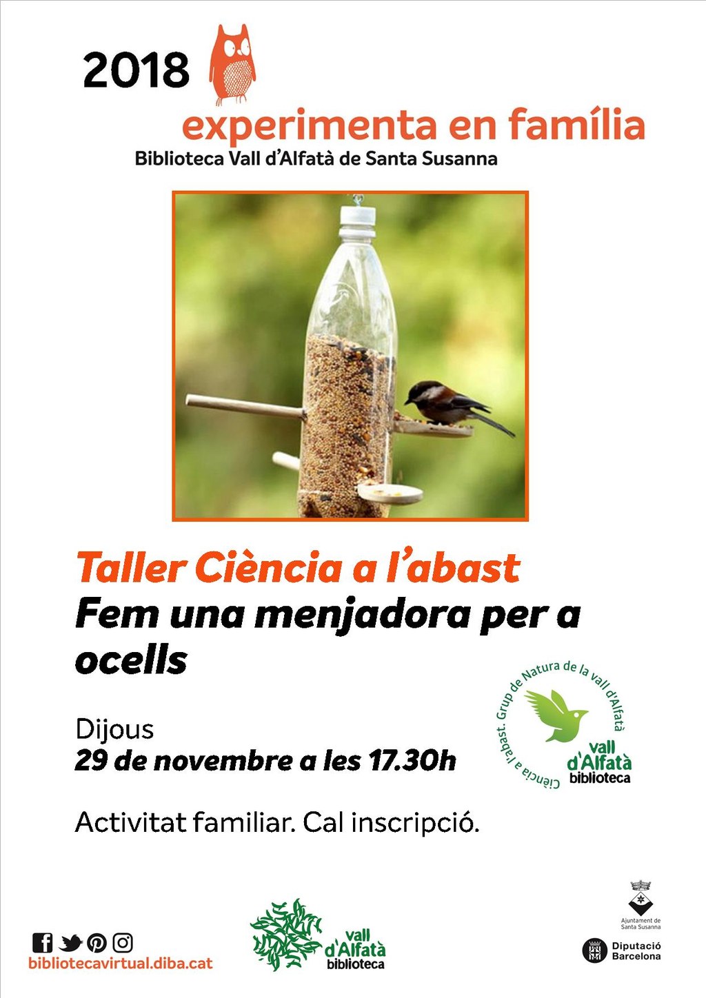 - Taller Ciència a l'abast: Fem una menjadora per a ocells. Activitat familiar. Cal inscripció.