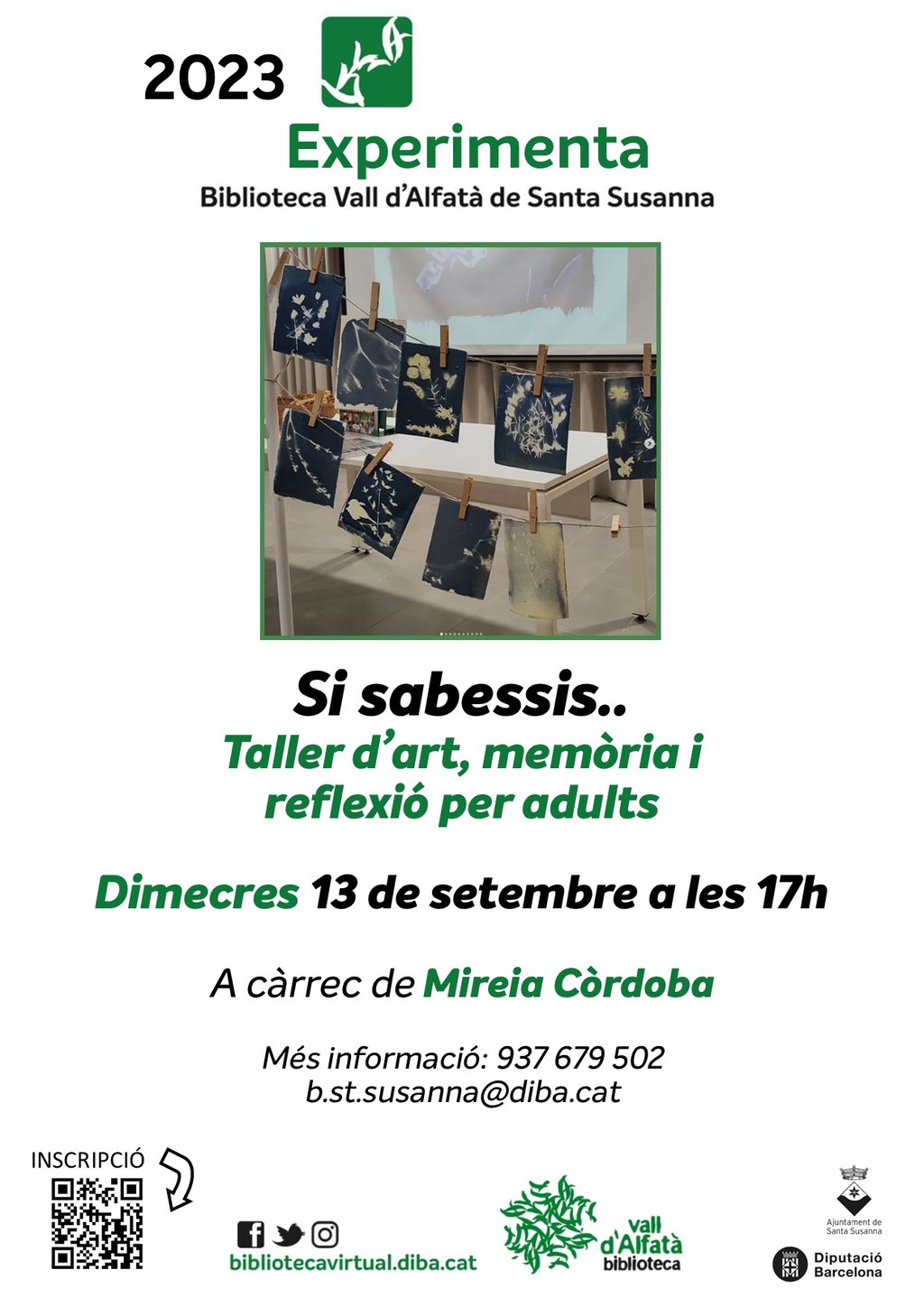 El pròxim dimecres 13 de setembre a partir de les 17 h, la Biblioteca Vall d'Alfatà organitza el "Taller d'art, memòria i reflexió per adults" dins del cicle "Experimenta: Si sabessis...". L'acte anirà a càrrec de Mireia Còrdoba.