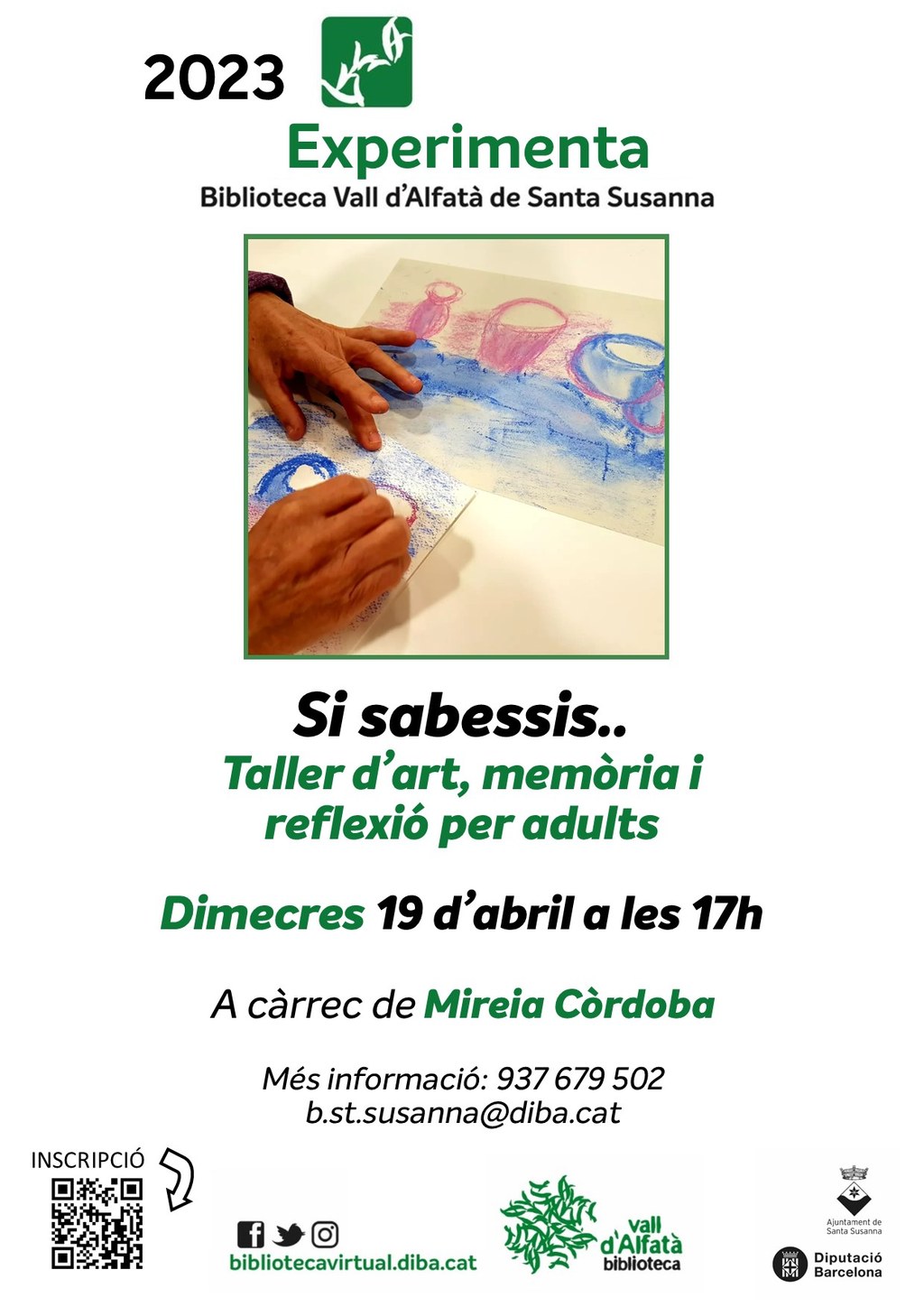 El pròxim dimecres 19 d'abril a les 17 h, la Biblioteca Vall d'Alfatà organitza el "Taller d'art, memòria i reflexió per adults" dins del cicle "Experimenta: Si sabessis...". L'acte anirà a càrrec de Mireia Còrdoba.