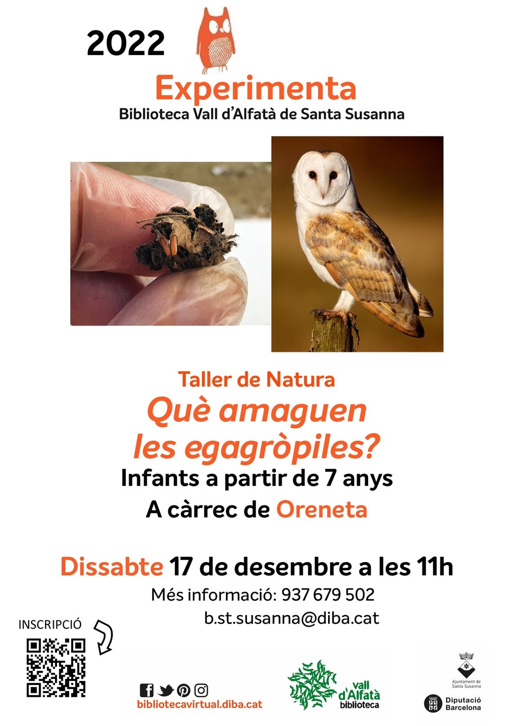 El pròxim dissabte 17 de desembre, la Biblioteca Vall d'Alfatà organitza el "Taller de Natura: Què amaguen les egagròpiles", una activitat emmarcada a l'Experimenta. L'acte s'iniciarà a les 11 h i anirà a càrrec d'Oreneta.