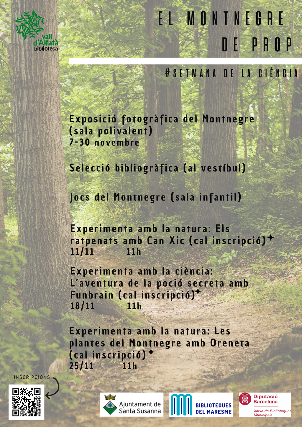Coincidint amb la Setmana de la Ciència, a la Biblioteca ens proposem donar a conèixer el parc del Montnegre mitjançant un grapat d'activitats per a tothom, especialment dirigides al públic infantil. Són aquestes: