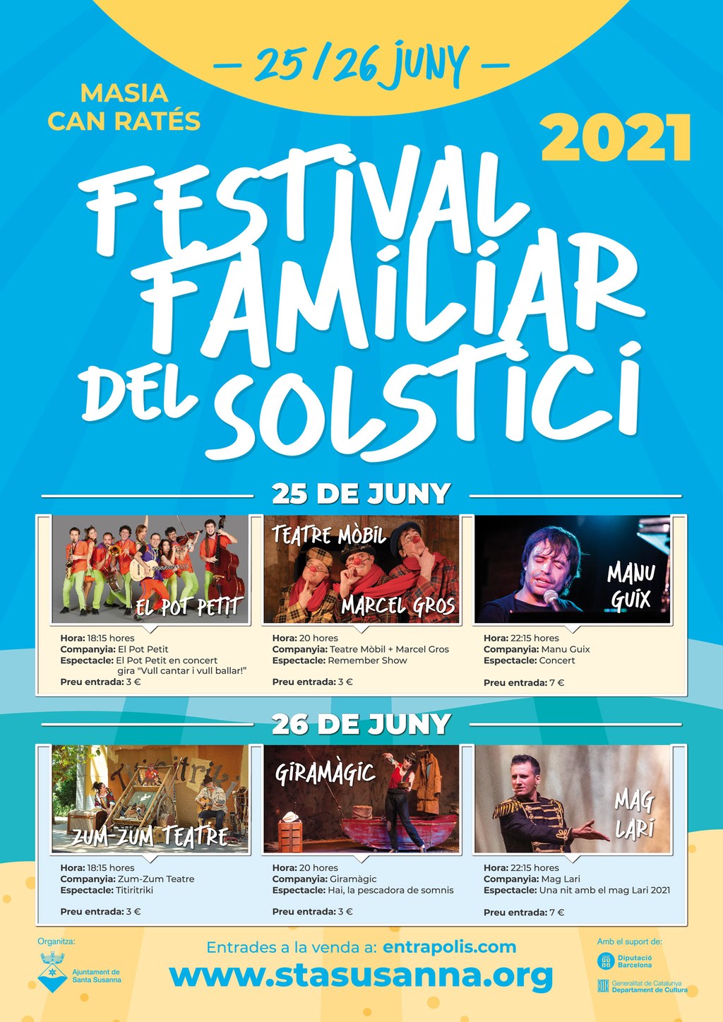 El Festival Familiar del Solstici de Santa Susanna torna aquest proper mes de juny. Els dies 25 i 26 es farà una nova edició d’aquest festival a la Masia de Can Ratés en un format diferent, amb motiu de la pandèmia, però amb una qualitat de primer nivell artístic. Venda d'entrades a www.entrapolis.com