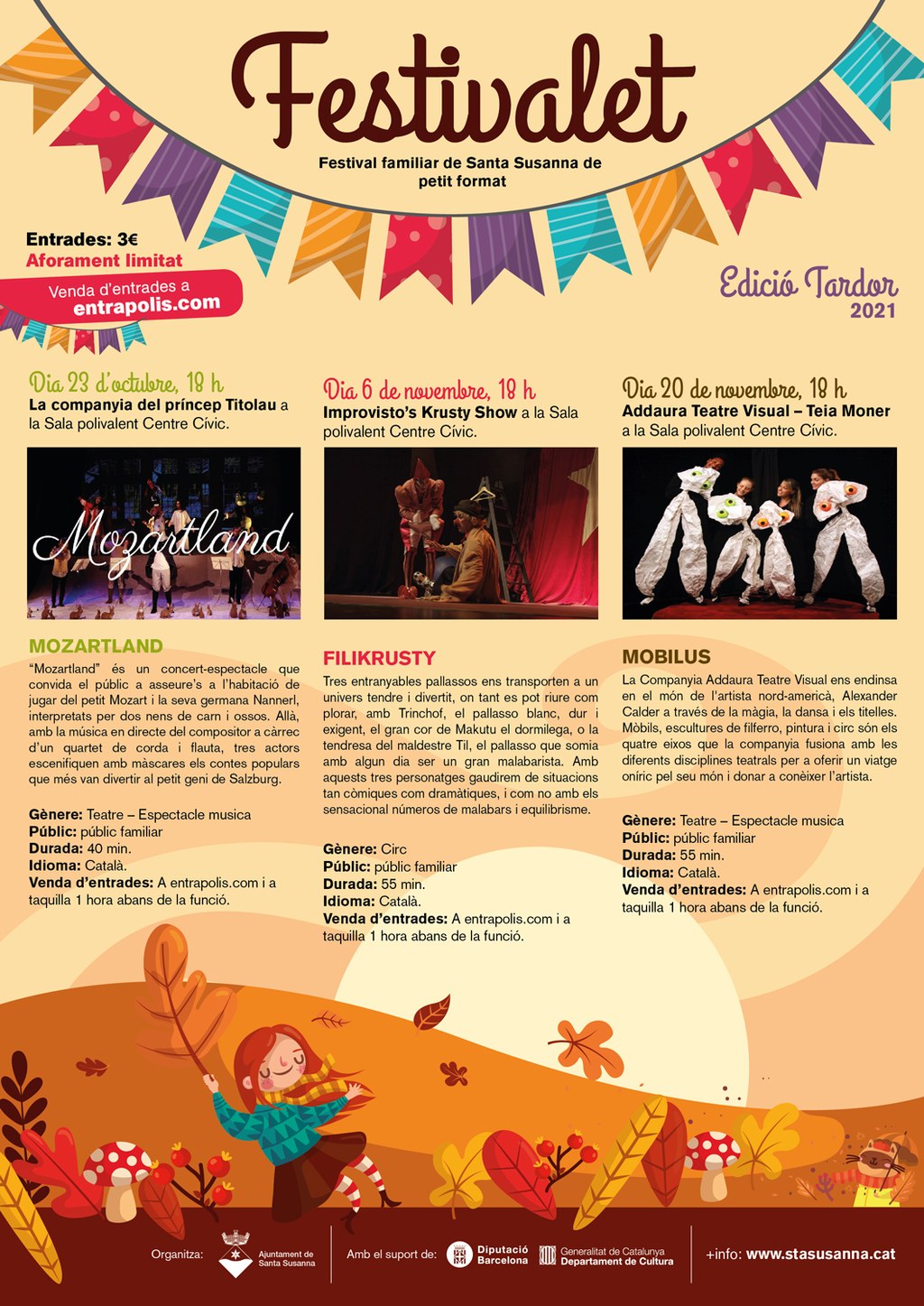- Engega una nova edició del Festivalet de Tardor, el festival familiar de petit format de Santa Susanna. - Mozartland, de La Companyia del Príncep Totilau | 23 d'octubre a les 18h - Filikrusty, d'Improvisto's Krusty Show | 6 de novembre a les 18h - Mobilus, d'Addaura Teatre Visual - Teia Moner | 20 de novembre a les 18h Les entrades es poden comprar a entrapolis.com.