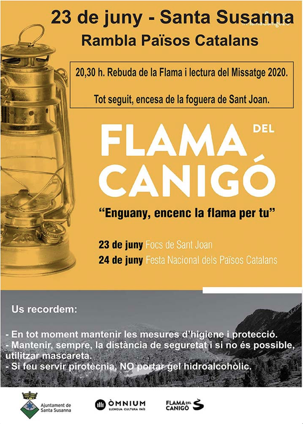 - Acte organitzat per Òmnium Cultural amb la col·laboració de l'Ajuntament. A les 20:30h hi haurà la rebuda de la Flama del Canigó i la lectura del Missatge 2020. Tot seguit, tindrà lloc l'encesa de la foguera de Sant Joan.