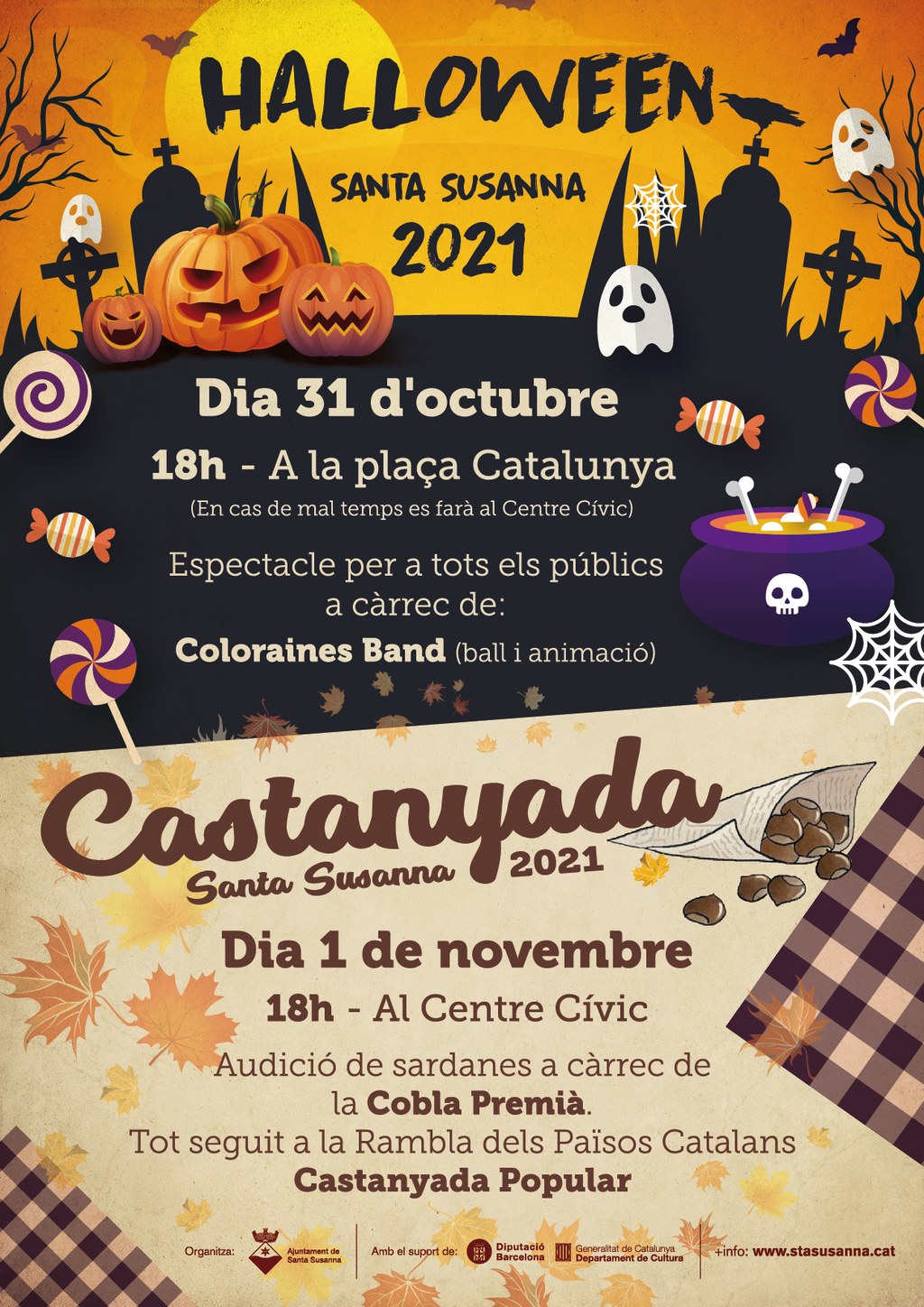 - Celebrem la nit més terrorífica de l'any amb un espectacle per a tothom a càrrec de Coloraines Band. L'endemà, no pot faltar la castanyada popular amb una prèvia de sardanes a càrrec de la Cobla Premià. Us hi esperem!