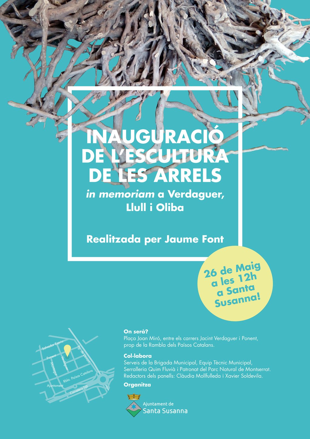 Inauguració de l'escultura de les arrels in memoriam a Verdaguer, Llull i Oliba realitzada per Jaume Font. Serà a la Plaça Joan Miró, entre els carrers Jacint Verdaguer i Ponent, prop de la Rambla dels Països Catalans.