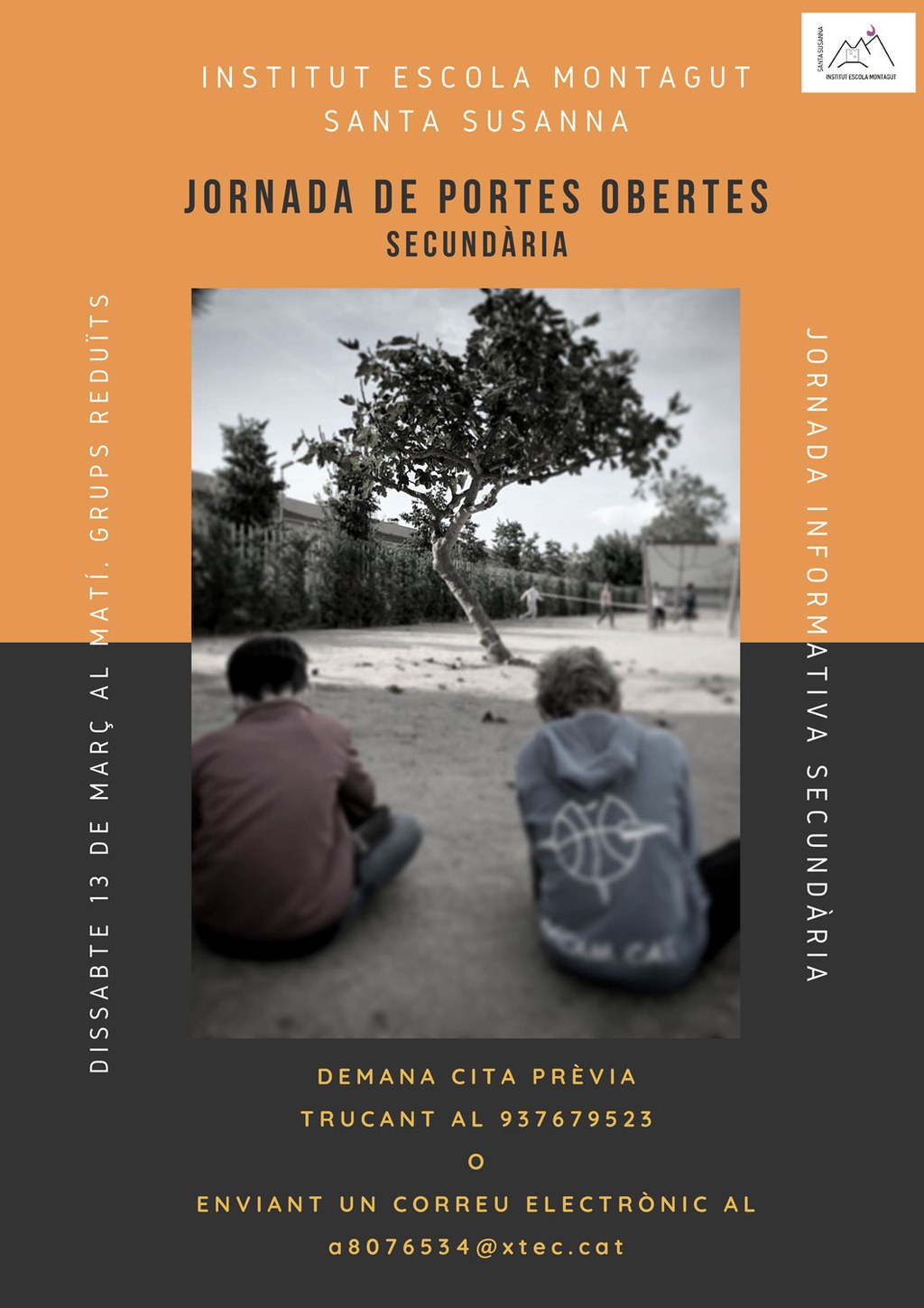 El dissabte 13 de març se celebrarà la jornada informativa de secundàris de l'Institut Escola Montagut. GRUPS REDUÏTS - Cal demanar cita prèvia trucant al 93 767 95 23 o enviant un email a a8076534@xtec.cat.