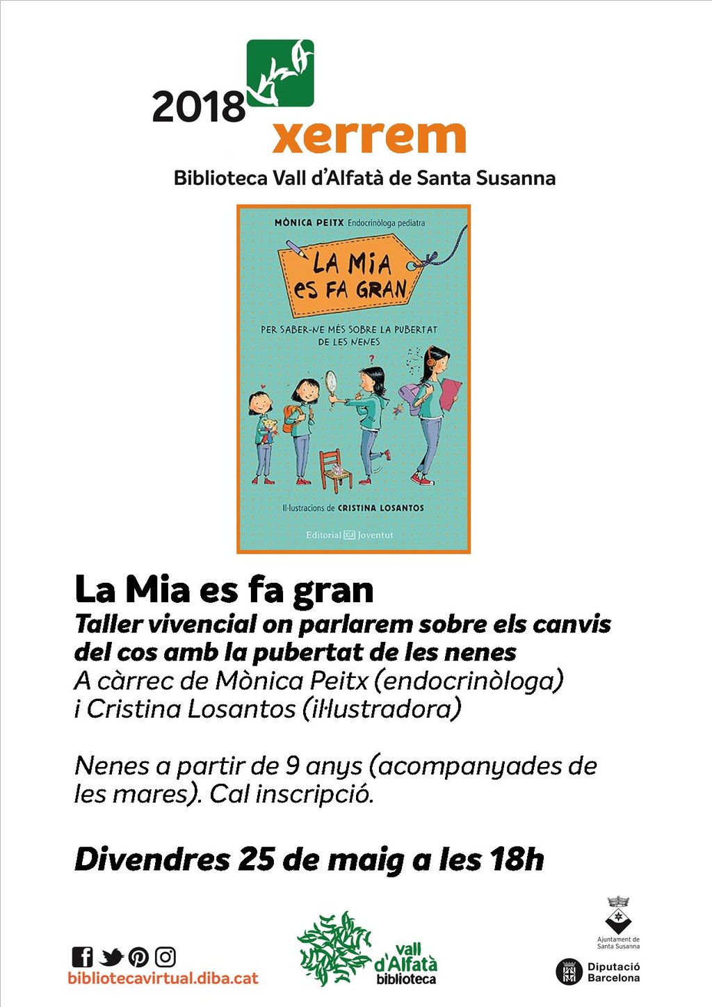 - Taller vivencial on parlarem sobre els canvis del cos amb la pubertat de les nenes. Una activitat a càrrec de Mònica Peitx (endocrinòloga) i Cristina Losantos (il·lustradora) dirigida a nenes a partir de 9 anys(acompanyades de les mares). Cal inscripció.
