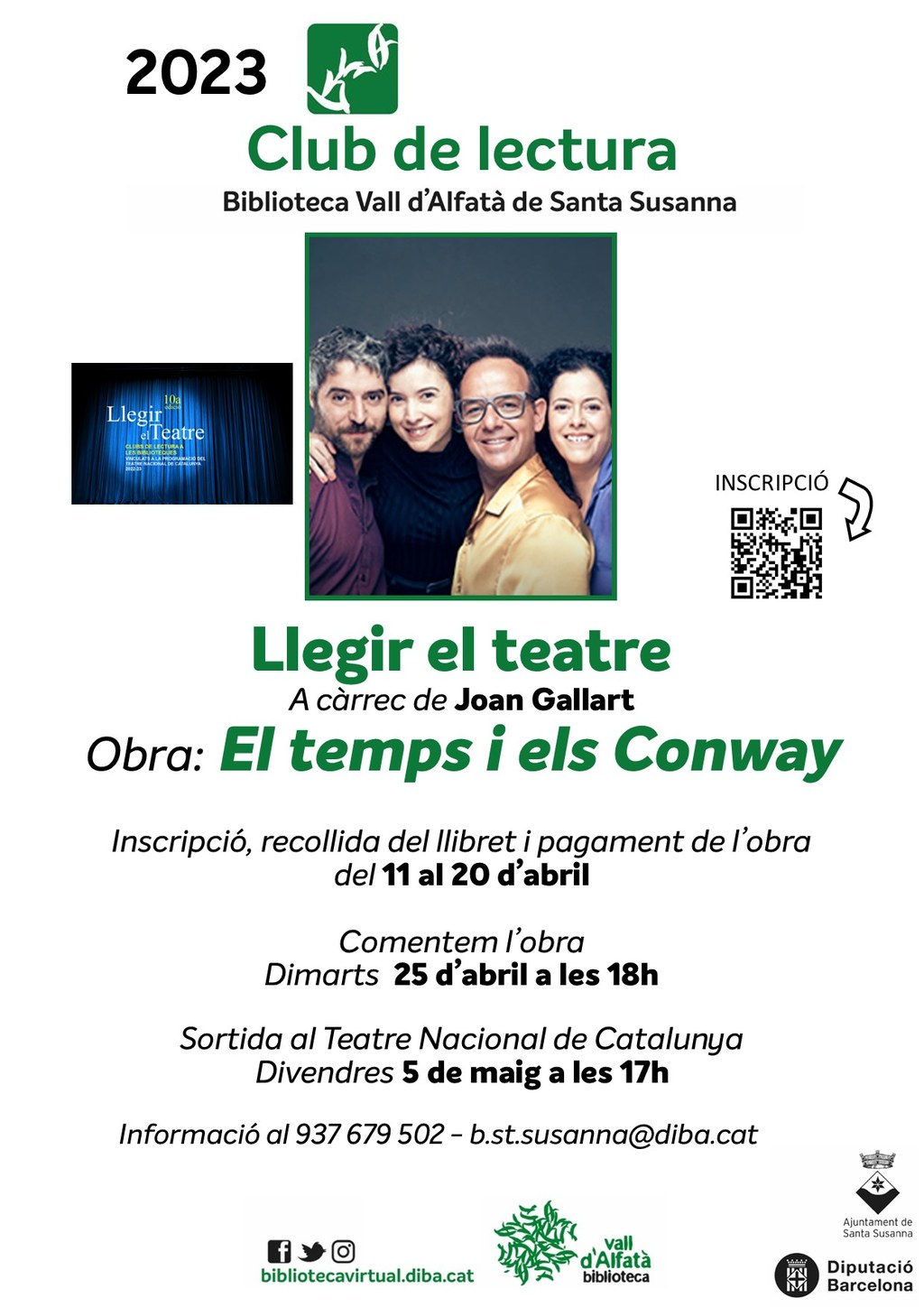De l'11 al 20 d'abril es podrà fer la inscripció, recollida del llibret i el pagament de l'obra "El temps i els Conway" a la Biblioteca Vall d'Alfatà amb motiu d'una nova sessió de "Llegir el teatre" del cicle "Club de lectura".