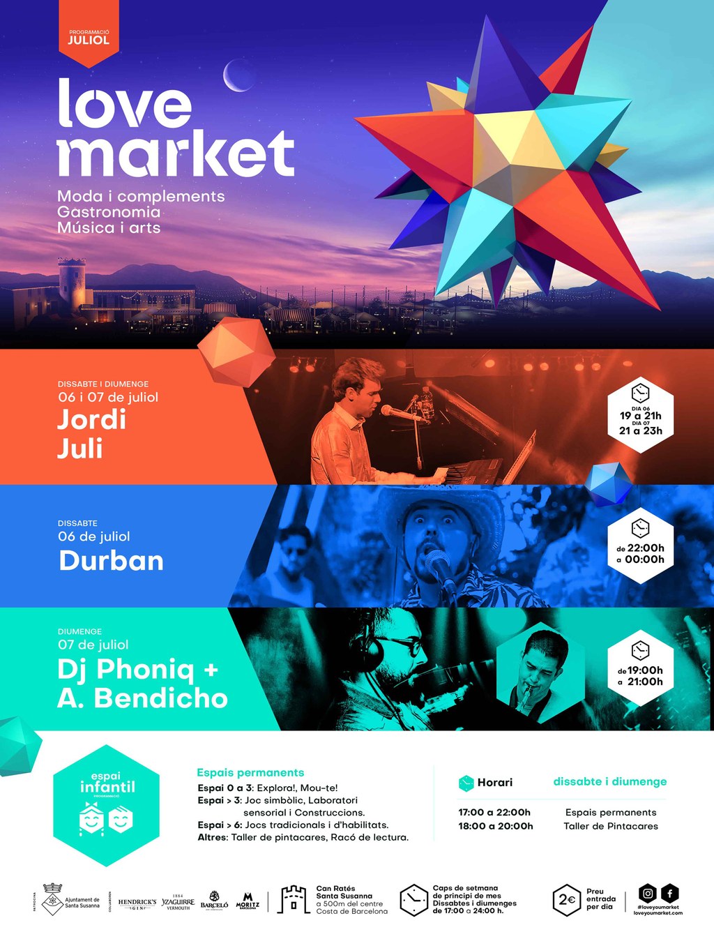 - Torna el Love Market a Santa Susanna el cap de setmana del 6 i 7 de juliol a Can Ratés. Amb els espais permanents, taller de pintacares i les actuacions de Jordi Juli, Durban i Dj Phoniq + A. Bendicho.