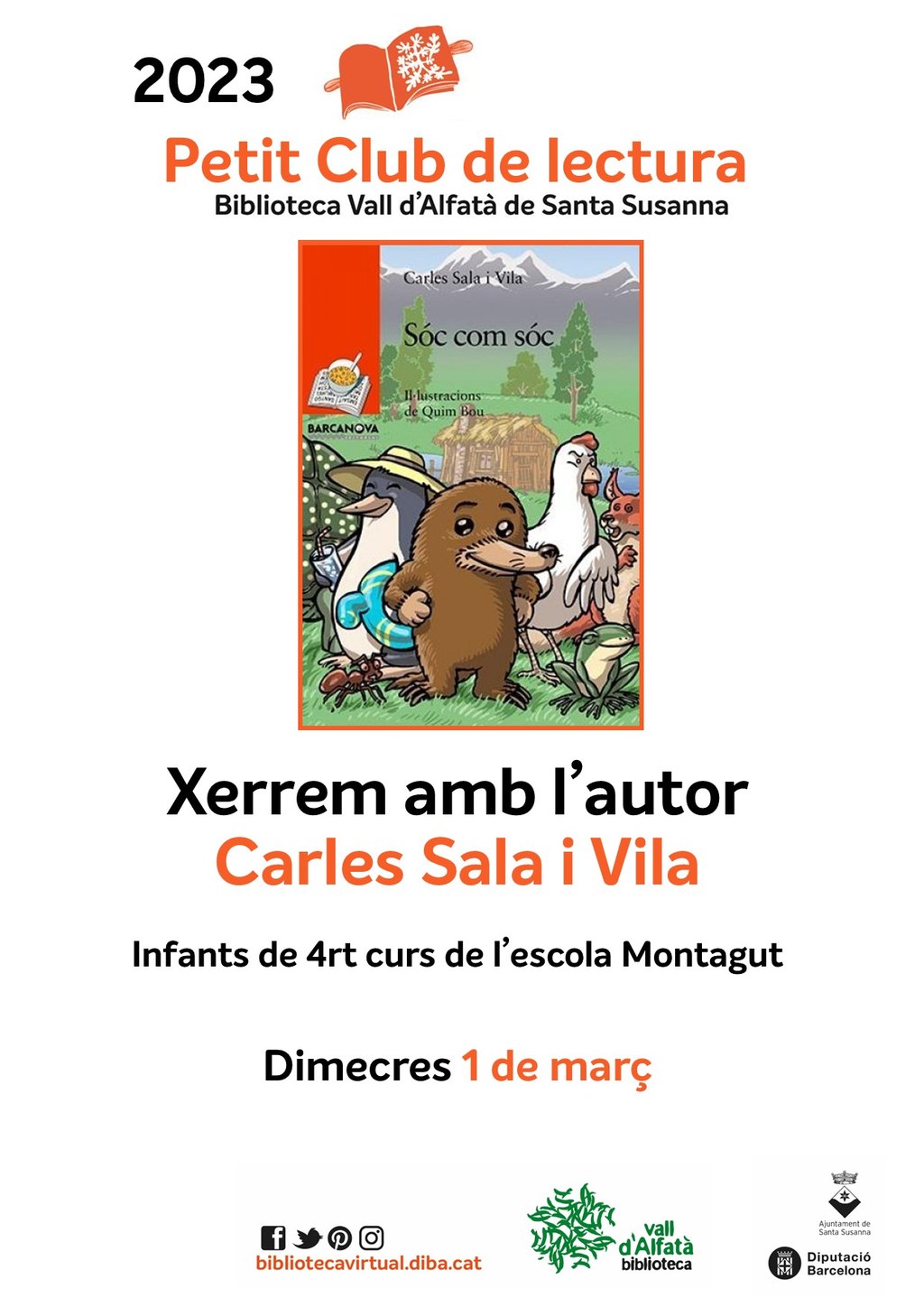 El pròxim 1 de març, la Biblioteca Vall d'Alfatà organitza una nova activitat dins del cicle "Petit Club de lectura". Es tracta del "Xerrem amb l'autor Carles Sala i Vila" on es tractarà l'obra "Sóc com sóc". L'acte està adreçat a infants de 4t curs de l'Escola Montagut.