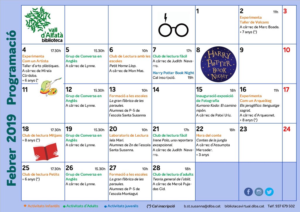 Ja podeu consultar les activitats programades pel mes de febrer a la Biblioteca Vall d'Alfatà. Trobareu les ja habituals com els "Club de lectura", "Experimenta", "Hora del conte" i molt més.
