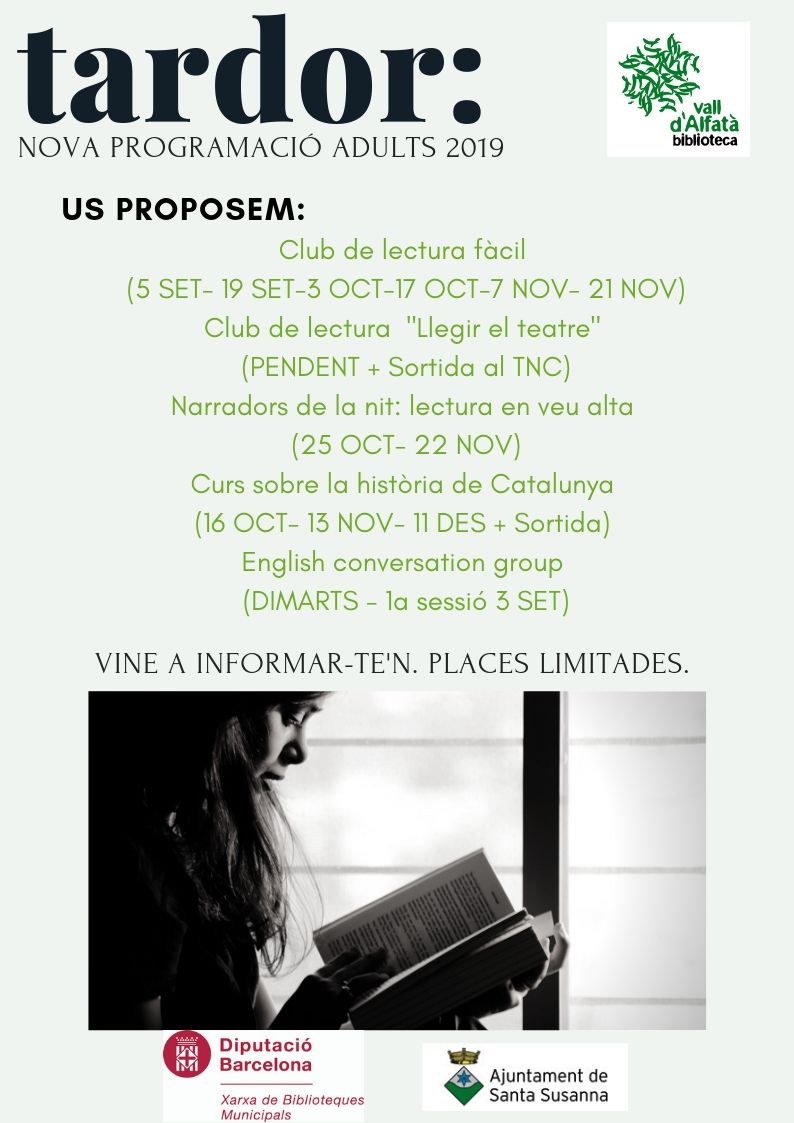 - Nova programació de tardor per a adults a la Biblioteca Vall d'Alfatà. Club de lectura fàcil Club de lectura "Llegir el Teatre" Narradors de la nit Curs sobre la història de Catalunya English conversation group Ves a informar-te'n, hi ha places limitades!