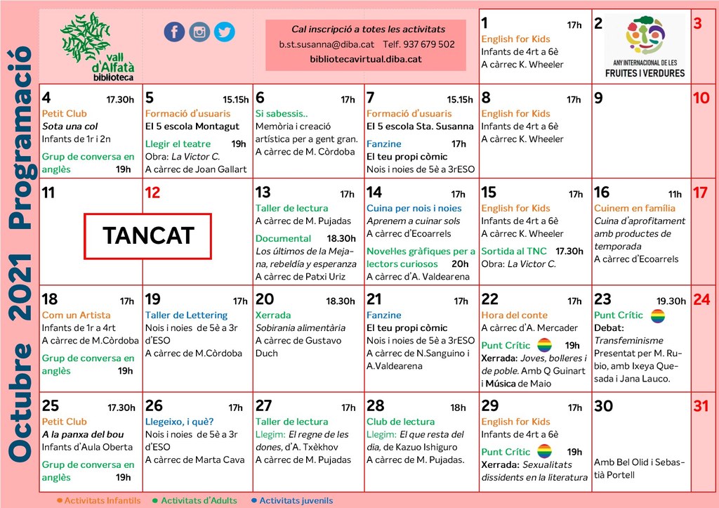 - Ja podeu consultar el programa d'activitats de la Biblioteca Vall d'Alfatà per al mes d'octubre. Recordeu que cal inscriure's prèviament a través d'aquest enllaç.
