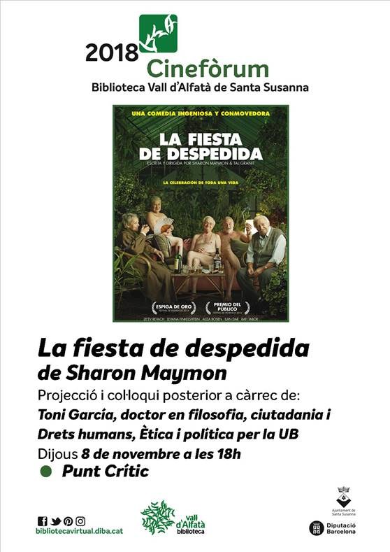 - Nova sessió de Cinefòrum, amb la projecció de la pel·lícula "La fiesta de despedida" de Sharon Maymon, i col·loqui posterior.