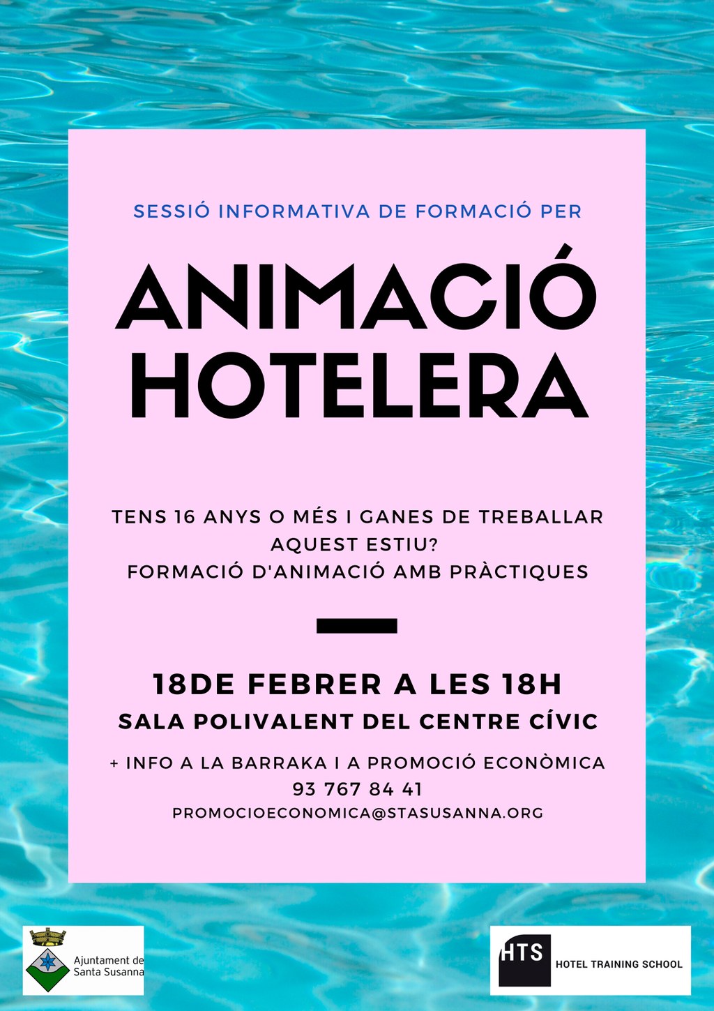 - Tens 16 anys o més i ganes de treballar aquest estiu? El proper 18 de febrer es portarà a terme una sessió informativa sobre la formació per animació hotelera. Es tracta d'una formació que inclou pràctiques. Pots descarregar-te la informació dels cursos clicant aquí.