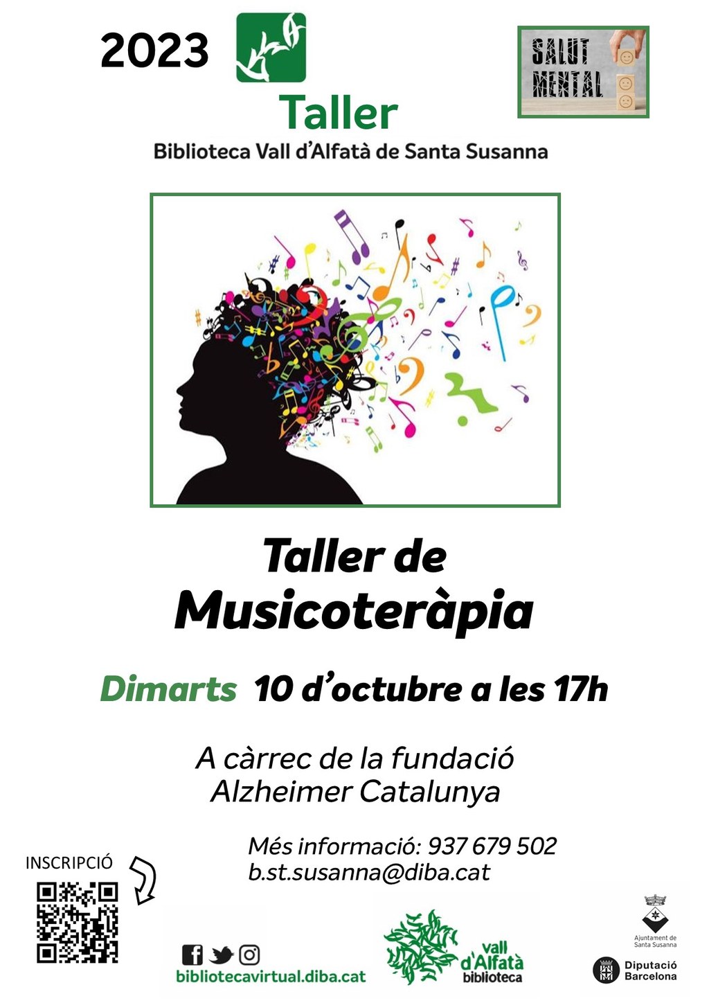 El pròxim dimarts 10 d'octubre a les 17 h, la Biblioteca Vall d'Alfatà organitza un Taller de Musicoteràpia. L'activitat anirà a càrrec de la fundació Alzheimer Catalunya.