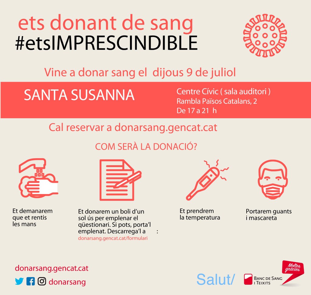 - Vine a donar sang dijous 9 de juliol a la sala auditori del Centre Cívic de Santa Susanna (Rambla Països Catalans, 2) Cal reservar hora prèviament a donarsang.gencat.cat Com serà la Donació: Et demanarem que et rentis les mans Et donarem un boli d'un sol ús per emplenar el qüestionari. Si pots, porta'l emplenat. Descarrega'l a donarsang.gencat.cat/formulari Et prendrem la temperatura Portarem guants i mascareta