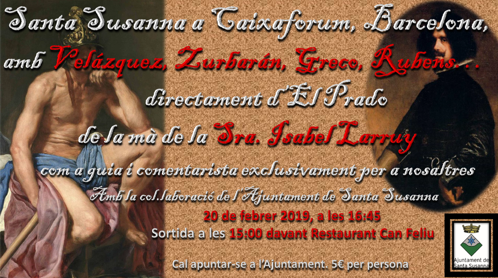 - Després de l'èxit de la visita a Caixaforum Barcelona per veure l'exposició de Toulouse Lautrec, el proper dia 20 d'aquest mes se'n durà a terme una altra. Aquesta vegada, dedicada a Velázquez (Zurbarán, El Greco, Rubens ...). La visita estarà guiada per Isabel Larruy i serà una oportunitat única tant per l'exposició en sí com per les explicacions de Larruy.