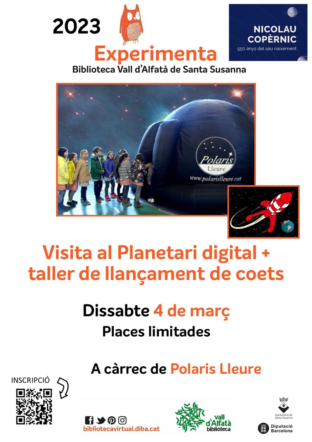 El pròxim 4 de març, la Biblioteca Vall d'Alfatà organitza una nova activitat dins del cicle "Experimenta". Es tracta de la Visita al Planetari Digital i el taller de llançament de coets. L'activitat, que ja no té més places, anirà a càrrec de Polaris Lleure.