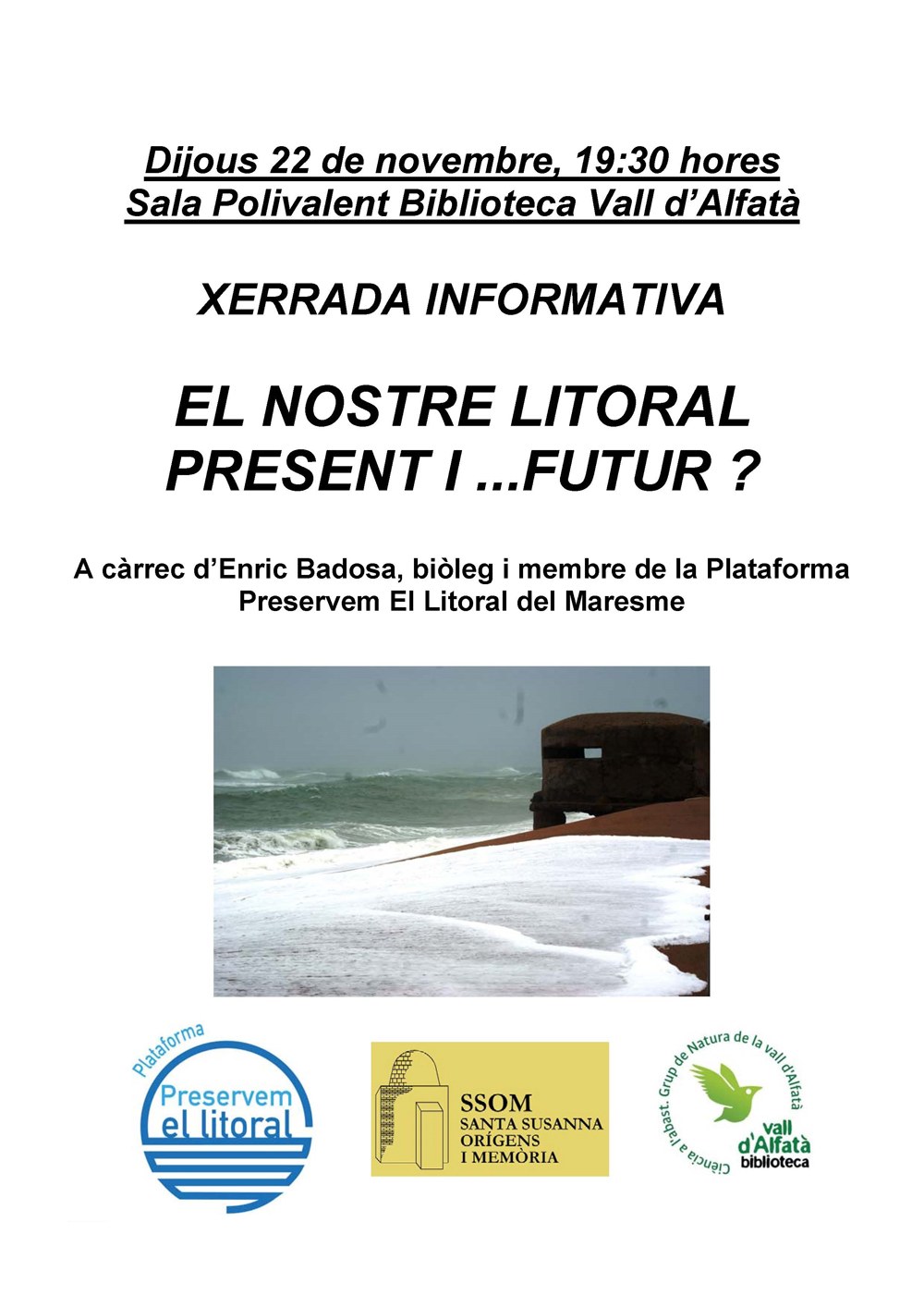 Xerrada informativa a càrrec d'Enric Badosa, biòleg i membre de la Plataforma Preservem el litoral del Maresme. Es debatrà la situació actual i futura del nostre litoral.
