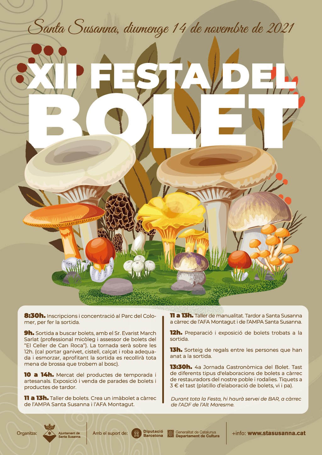 Arriba la 12a edició de la Festa del Bolet de Santa Susanna. Hi haurà una sortida a caçar bolets, un mercat de productes de temporada i artesanals, uns tallers de bolets i manualitats, l'exposició dels bolets trobats a la sortida, un sorteig de regals entre els participants de la sortida, i la 4a Jornada Gastronòmica del Bolet.
