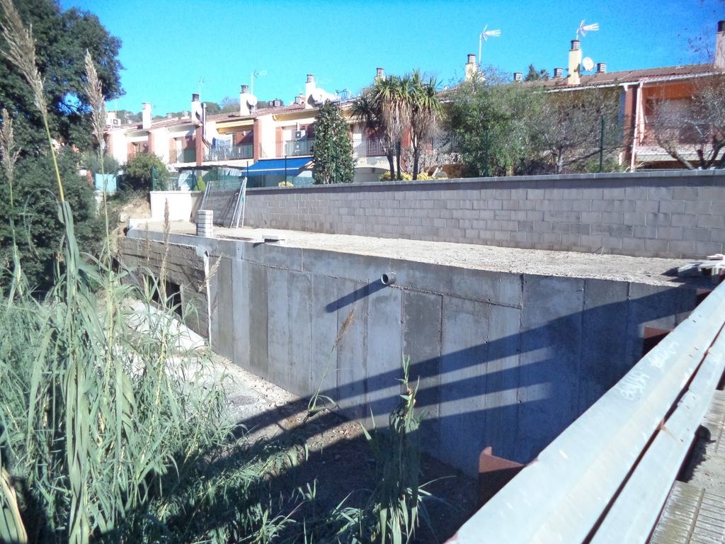 El mur, que actuava com a canalització de la Riera, s'ha hagut d'enderrocar atesa la manca de garanties estructurals i s'ha reconstruït completament seguint les indicacions de l'Agència Catalana de l'Aigua (ACA) al trobar-se dins la zona de servitud d'aigües.