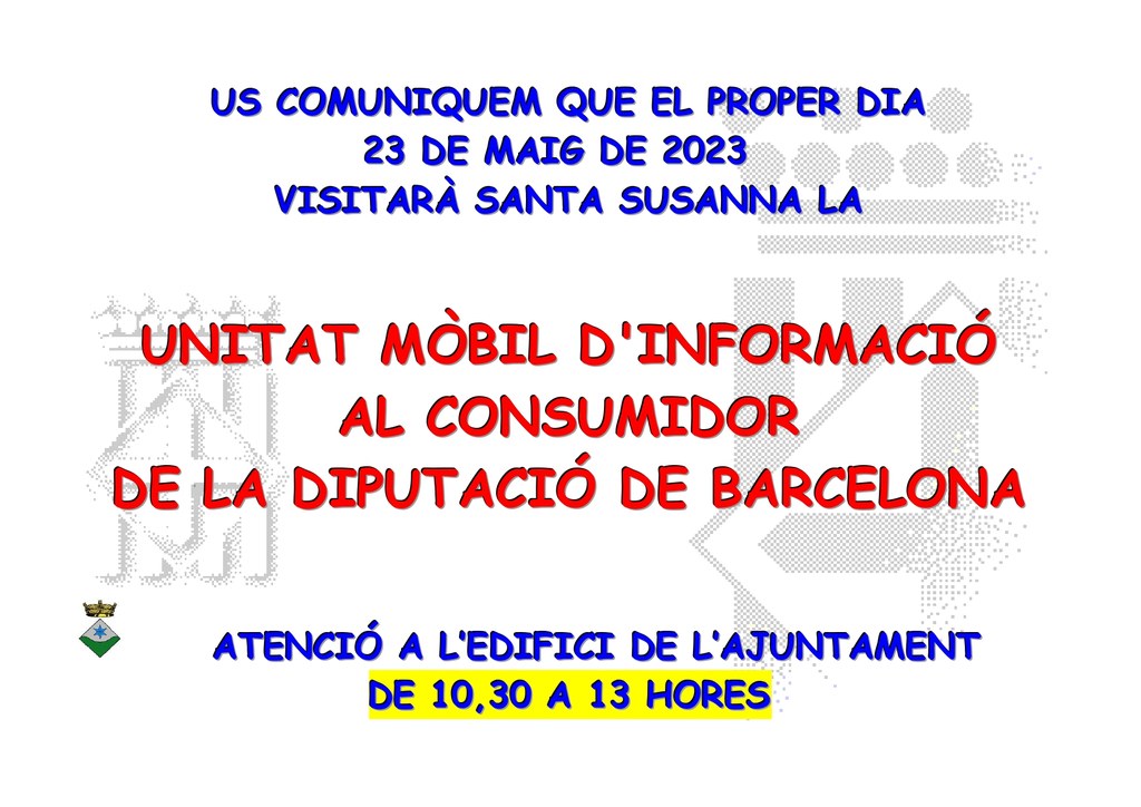 El dia 23 de maig ens visita la Unitat Mòbil d'Informació al Consumidor de la Diputació de Barcelona perquè tots els veïns i veïnes de Santa Susanna puguin presentar les seves consultes i reclamacions gratuïtament. L'horari serà de 10:30 h a 13 h i serà a l'edifici de l'Ajuntament.