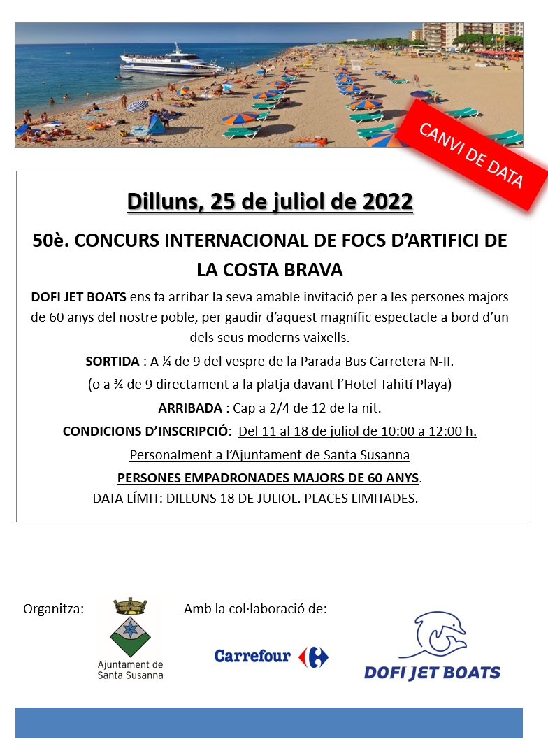 El 50è Concurs Internacional de Focs d'Artifici de la Costa Brava canvia de data i es durà a terme el pròxim dilluns, 25 de juliol. Des de Dofi Jet Boats conviden a les persones majors de 60 anys de Santa Susanna en un esdeveniment on podran gaudir d'un magnífic espectacle a bord d'un dels seus moderns vaixells.