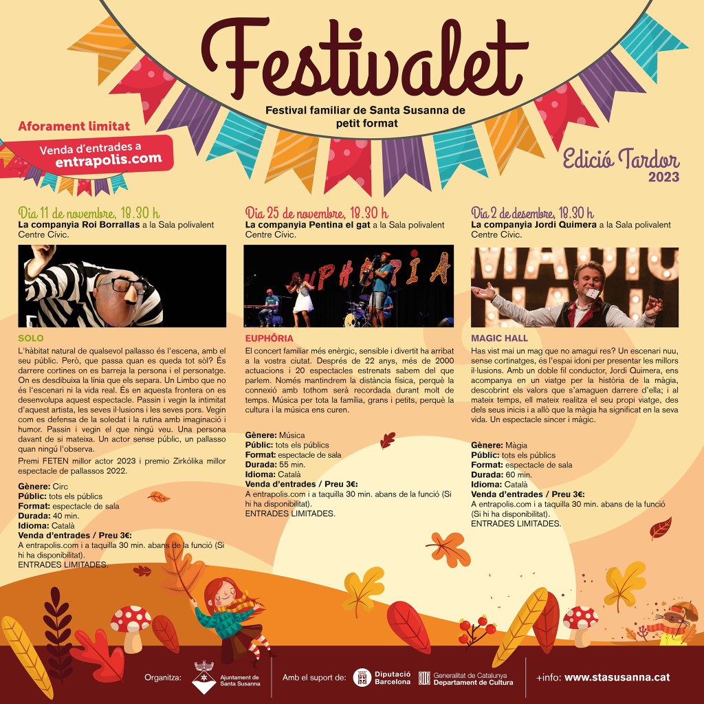 Amb l'arribada de la tardor, a Santa Susanna també ho fa el Festivalet, el Festival familiar de Santa Susanna de petit format. Enguany, constarà de tres obres que es realitzaran cada dues setmanes al nostre poble: