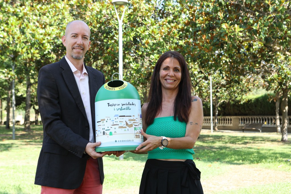 La regidora de Sostenibilitat, Sílvia Vives, i el gerent d’Ecovidrio a Catalunya, Ivan Costa, impulsen la campanya Banderes Verdes de reciclatge d’envasos de vidre