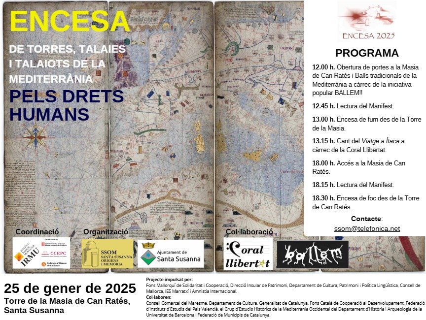 El proper dissabte, 25 de gener, s'il·luminaran torres, talaies i talaiots a tota la Mediterrània en suport als Drets HumansCada any, innumerables persones són forçades a fugir de les seves llars, moltes perdent les seves vides en la nostra mar. Encendre aquests senyals històrics és una potent manera de destacar aquesta crisi humanitària i mostrar solidaritat.https://www.stasusanna.cat/ca/actualitat/noticies/el-proper-dissabte-25-de-gener-silluminaran-torres-talaies-i-talaiots-a-tota-la-mediterrania-en-suport-als-drets-humanshttps://www.stasusanna.cat/ca/actualitat/noticies/el-proper-dissabte-25-de-gener-silluminaran-torres-talaies-i-talaiots-a-tota-la-mediterrania-en-suport-als-drets-humans/@@images/image-1200-7841b13ce9fdcbf438ddf91d866b1aa2.jpeg